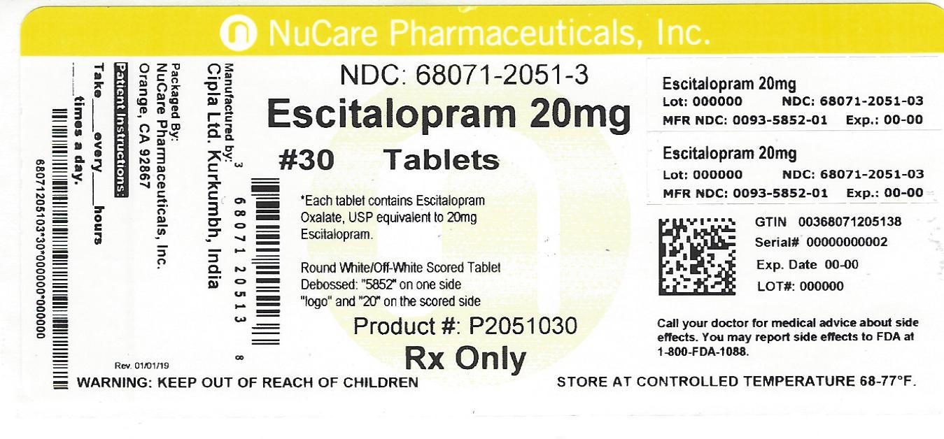 The following 3 images provide visual information about the product associated with Escitalopram NDC 68071-2051 by Nucare Pharmaceuticals,inc., such as packaging, labeling, and the appearance of the drug itself. This resource could be helpful for medical professionals, pharmacists, and patients seeking to verify medication information and ensure they have the correct product.