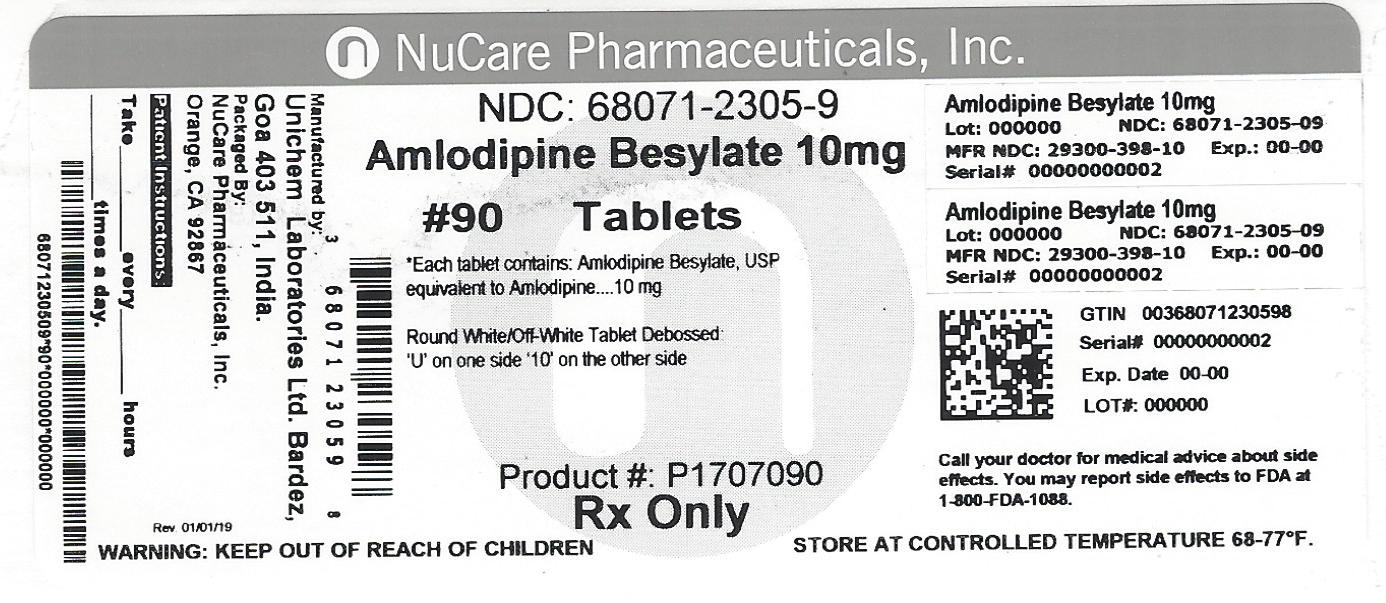 The following 6 images provide visual information about the product associated with Amlodipine Besylate NDC 68071-2305 by Nucare Pharmaceuticals,inc., such as packaging, labeling, and the appearance of the drug itself. This resource could be helpful for medical professionals, pharmacists, and patients seeking to verify medication information and ensure they have the correct product.