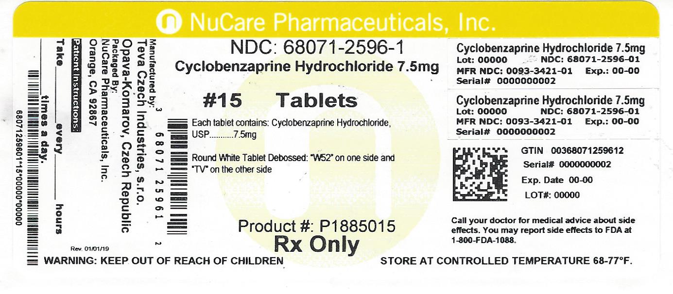 This is a label for a medication bottle of Cyclobenzaprine Hydrochloride 7.5mg with Lot number 00000 and NDC number 68071-2596-01. The bottle has 15 round white tablets that are marked W52 on one side and X S 5 on the other. Patients are encouraged to call their doctor for any side effects and should store the medication at a controlled temperature of 68-77°F. The label also warns to keep out of reach of children. The expiration date is not readable.*