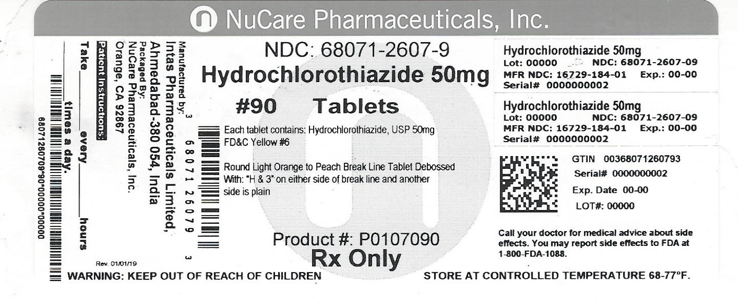 This is a description of NuCare Pharmaceuticals' Hydrochlorothiazide 50mg tablets bottled under the NDC number 68071-2607-09. The bottle contains 90 round light orange to peach break line tablets with an imprint of "H" on one side of the break line and "3" on another side, and the lot number 00000. The tablets contain Hydrochlorothiazide, USP 50mg as the active ingredient. The bottles should be kept out of reach of children and stored within a controlled temperature range of 68-77°F. Consumers should call their doctor if there are any side effects from taking these tablets, and they can also report adverse events to the FDA. The expiration date of the tablets is 00-00.*