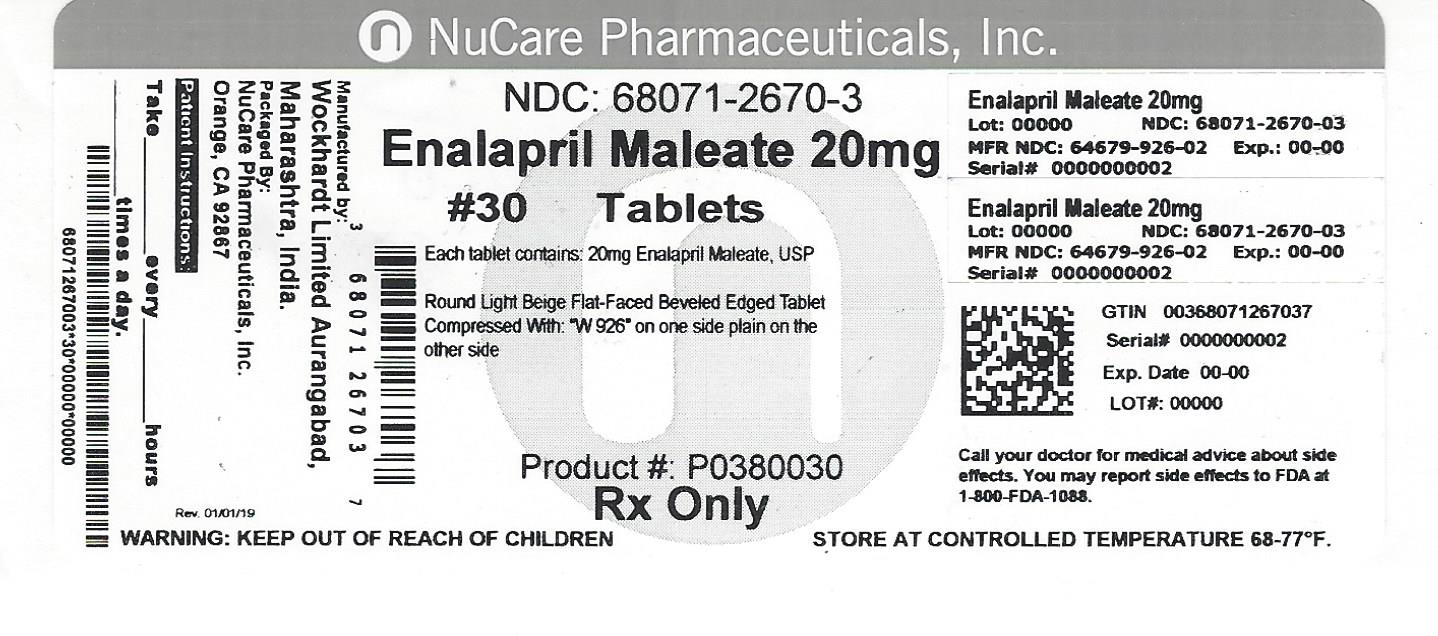 The following 2 images provide visual information about the product associated with Enalapril Maleate NDC 68071-2670 by Nucare Pharmaceuticals,inc., such as packaging, labeling, and the appearance of the drug itself. This resource could be helpful for medical professionals, pharmacists, and patients seeking to verify medication information and ensure they have the correct product.