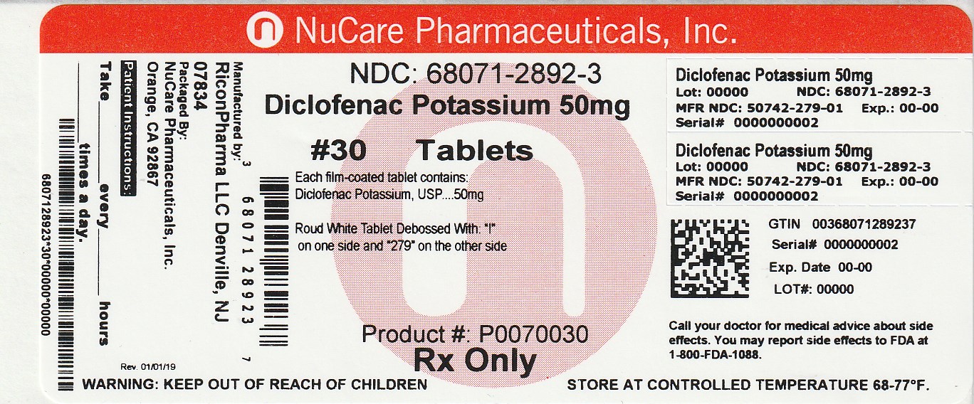 Diclofenac potassium tablets, USP are a benzeneacetic acid derivative. Diclofenac potassium tablets are available as tablets of 50 mg (white) for oral administration. Diclofenac potassium, USP is a white or slightly yellowish crystalline powder and is sparingly soluble in water at 25°C. The chemical name is 2-[(2,6-dichlorophenyl)amino] benzeneacetic acid, monopotassium salt. The molecular weight is 334.24 g/mol. Its molecular formula is C 14H 10Cl 2NKO 2, and it has the following structural formula: