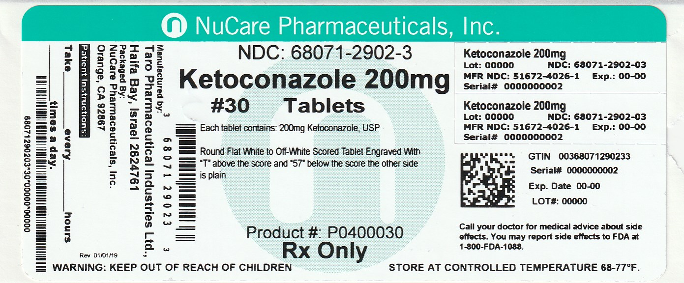 Ketoconazole tablets USP, 200 mg are white to off-white round, flat tablets, one side scored and engraved with "T" above the score and "57" below the score. The other side is plain. They are supplied in bottles of 30 tablets(NDC 68071-2902-3);