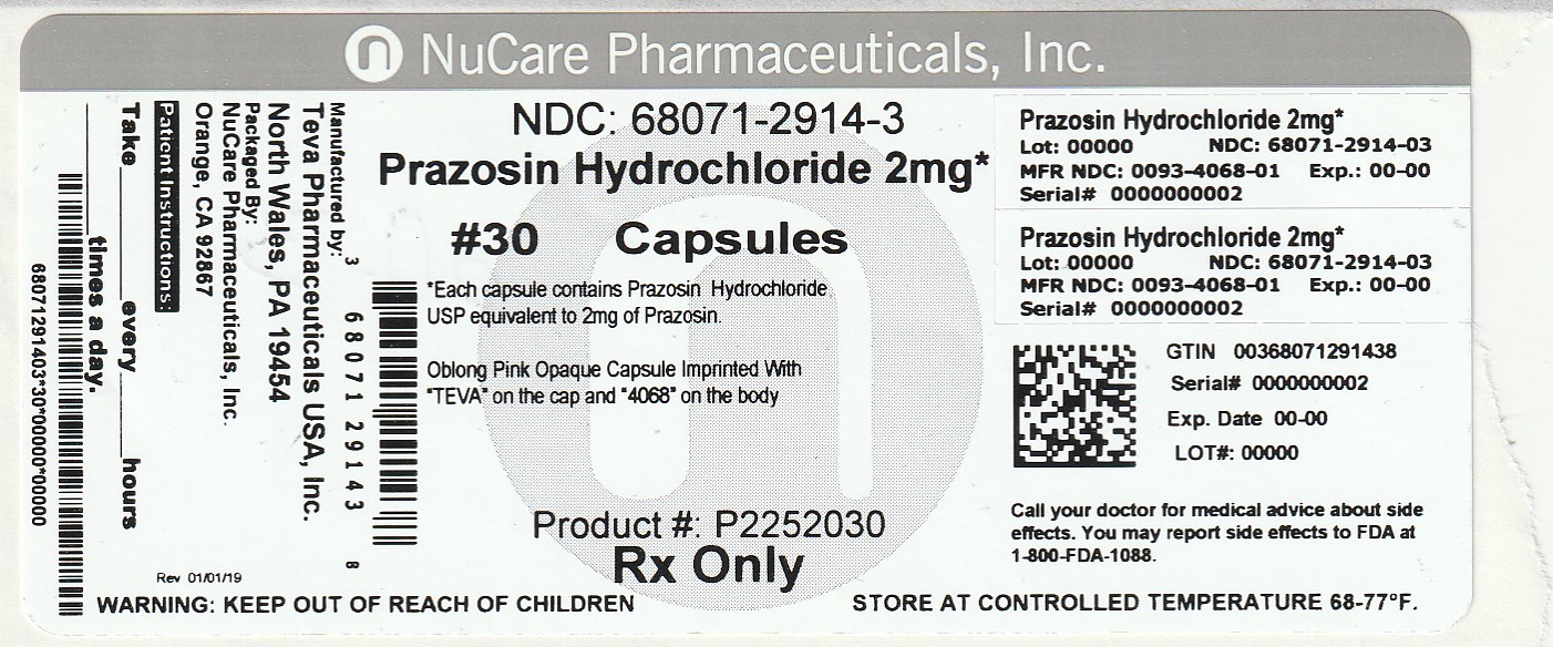 The following 2 images provide visual information about the product associated with Prazosin Hydrochloride NDC 68071-2914 by Nucare Pharmaceuticals,inc., such as packaging, labeling, and the appearance of the drug itself. This resource could be helpful for medical professionals, pharmacists, and patients seeking to verify medication information and ensure they have the correct product.
