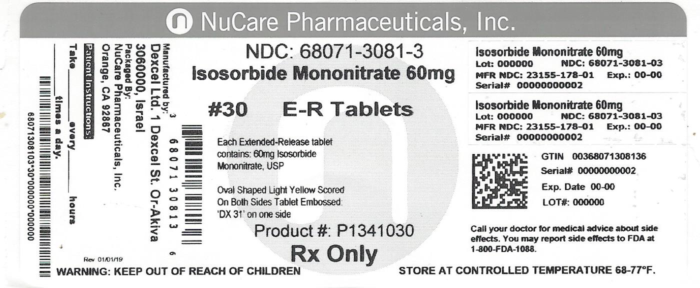 The following 2 images provide visual information about the product associated with Isosorbide Mononitrate NDC 68071-3081 by Nucare Pharmaceuticals, Inc., such as packaging, labeling, and the appearance of the drug itself. This resource could be helpful for medical professionals, pharmacists, and patients seeking to verify medication information and ensure they have the correct product.