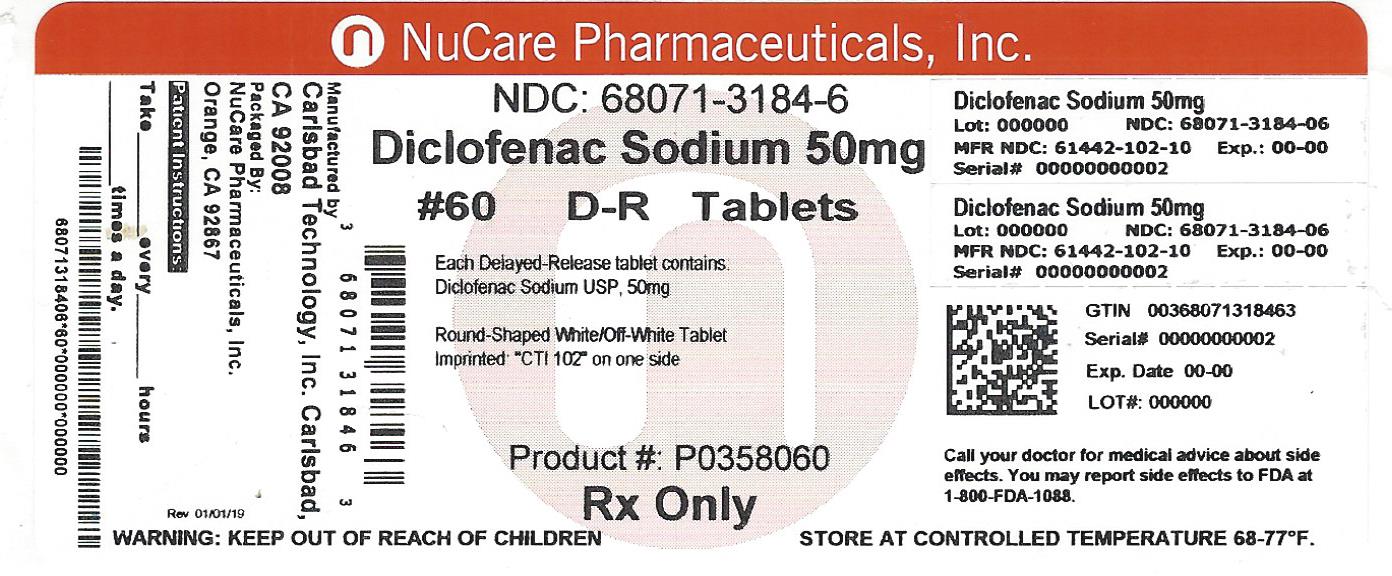 The following 3 images provide visual information about the product associated with Diclofenac Sodium Delayed Release NDC 68071-3184 by Nucare Pharmaceuticals, Inc., such as packaging, labeling, and the appearance of the drug itself. This resource could be helpful for medical professionals, pharmacists, and patients seeking to verify medication information and ensure they have the correct product.