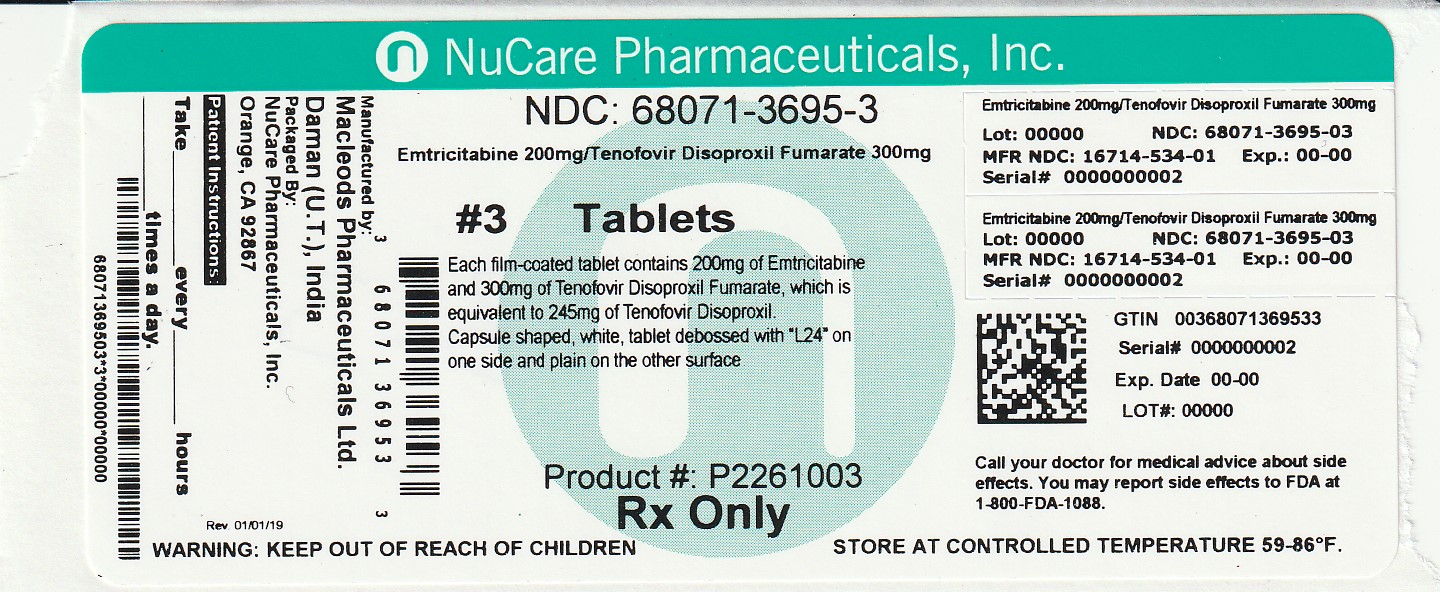 The following 3 images provide visual information about the product associated with Emtricitabine And Tenofovir Disoproxil Fumarate NDC 68071-3695 by Nucare Pharmaceuticals, Inc., such as packaging, labeling, and the appearance of the drug itself. This resource could be helpful for medical professionals, pharmacists, and patients seeking to verify medication information and ensure they have the correct product.