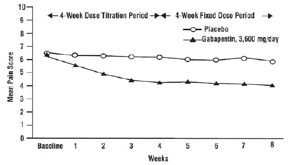 Gabapentin was evaluated for the management of postherpetic neuralgia (PHN) in two randomized, double-blind, placebo-controlled, multicenter studies. The intent-to-treat (ITT) population consisted of a total of 563 patients with pain for more than 3 months after healing of the herpes zoster skin rash (Table 6).