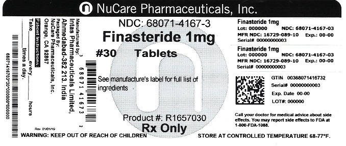 This is a description of a medication called Finasteride, manufactured by NuCare Pharmaceuticals, Inc. It comes in the form of 30 tablets, with the NDC number 68071-4167-3. The medicine is only available through a prescription from a healthcare provider, and it is recommended to read the manufacturer's label for a complete list of ingredients. The medication should be stored in controlled temperature at 68.77°F and should be kept out of reach of children. reported side effects can be consulted with a doctor. The product number is R1657030, and the expiration date is not disclosed.*