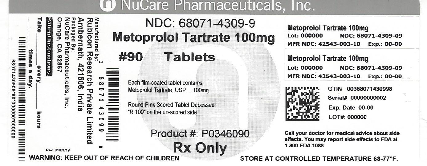 The following 2 images provide visual information about the product associated with Metoprolol Tartrate NDC 68071-4309 by Nucare Pharmaceuticals,inc., such as packaging, labeling, and the appearance of the drug itself. This resource could be helpful for medical professionals, pharmacists, and patients seeking to verify medication information and ensure they have the correct product.