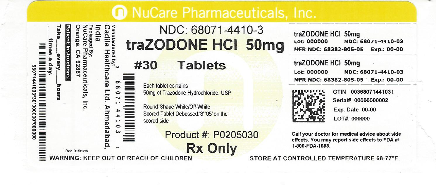 The following 3 images provide visual information about the product associated with Trazodone Hydrochloride NDC 68071-4410 by Nucare Pharmaceuticals,inc., such as packaging, labeling, and the appearance of the drug itself. This resource could be helpful for medical professionals, pharmacists, and patients seeking to verify medication information and ensure they have the correct product.