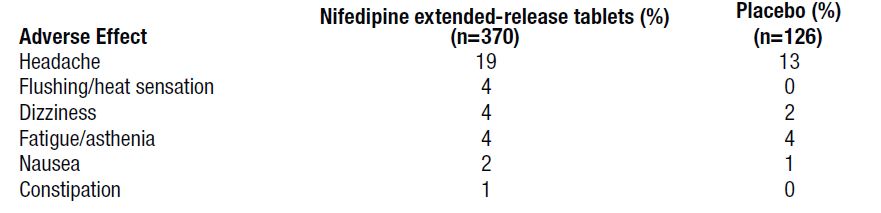 The most common adverse event reported with nifedipine extendedrelease tablets was peripheral edema. This was dose related and the frequency was 18% on nifedipine extendedrelease tablets 30 mg daily, 22% on nifedipine extendedrelease tablets 60 mg daily and 29% on nifedipine extendedrelease tablets 90 mg daily versus 10% on placebo.