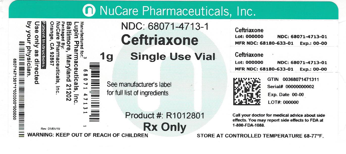 The following 2 images provide visual information about the product associated with Ceftriaxone NDC 68071-4713 by Nucare Pharmaceuticals,inc., such as packaging, labeling, and the appearance of the drug itself. This resource could be helpful for medical professionals, pharmacists, and patients seeking to verify medication information and ensure they have the correct product.
