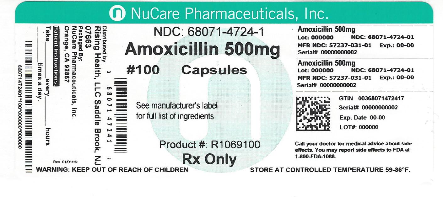 The following 2 images provide visual information about the product associated with Amoxicillin NDC 68071-4724 by Nucare Pharmaceuticals,inc., such as packaging, labeling, and the appearance of the drug itself. This resource could be helpful for medical professionals, pharmacists, and patients seeking to verify medication information and ensure they have the correct product.