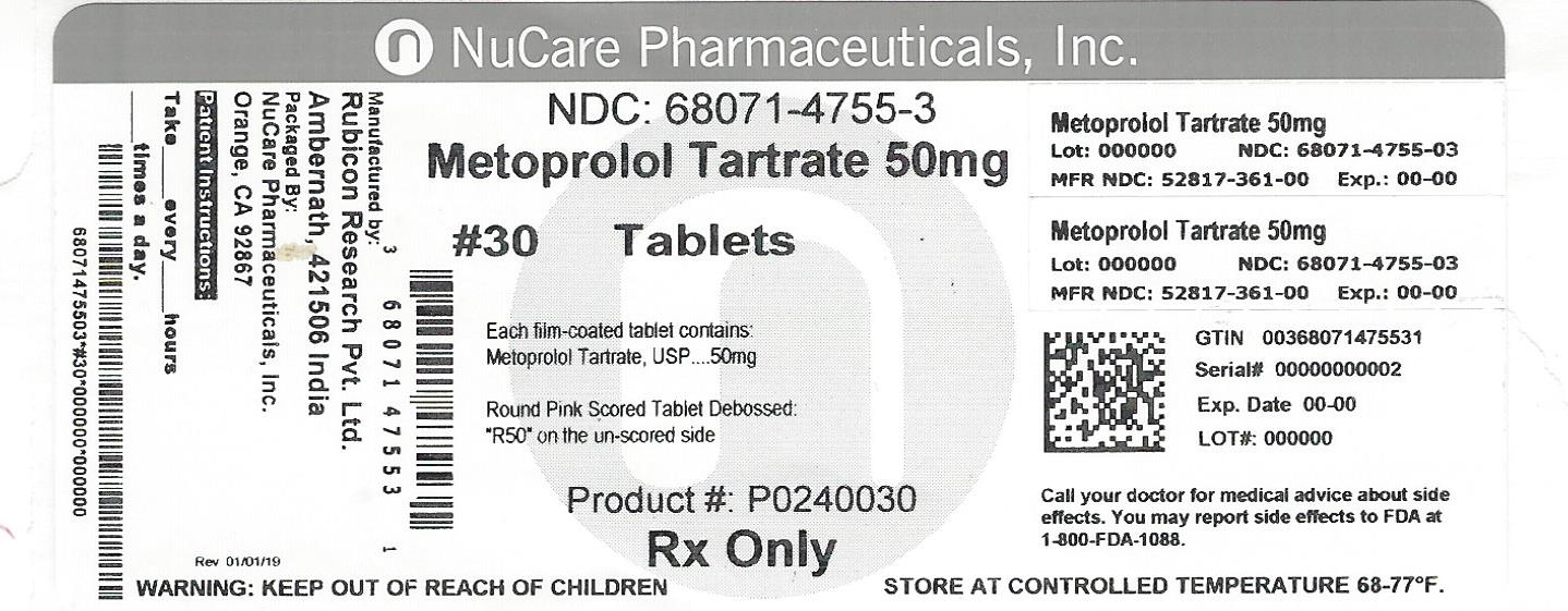 The following 2 images provide visual information about the product associated with Metoprolol Tartrate NDC 68071-4755 by Nucare Pharmaceuticals,inc., such as packaging, labeling, and the appearance of the drug itself. This resource could be helpful for medical professionals, pharmacists, and patients seeking to verify medication information and ensure they have the correct product.