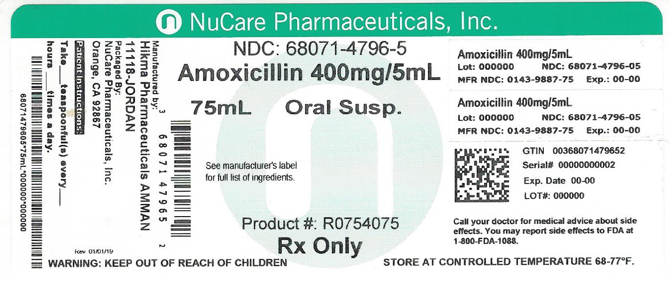 The following 2 images provide visual information about the product associated with Amoxicillin NDC 68071-4796 by Nucare Pharmaceuticals,inc., such as packaging, labeling, and the appearance of the drug itself. This resource could be helpful for medical professionals, pharmacists, and patients seeking to verify medication information and ensure they have the correct product.