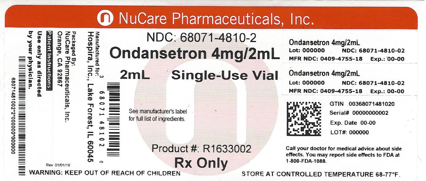 NuCare Pharmaceuticals, Inc. produces a medication called Ondansetron 4mg/2mL, which comes in a single-use vial. The medication is a prescription drug and should be kept out of reach of children. The product's NDC number is 68071-4810-2, and its lot number is 000000. The recommended storage temperature is between 68-77°F. Patients should consult their doctors about any potential side effects and can report them to the FDA at 1-800-FDA-1088.*