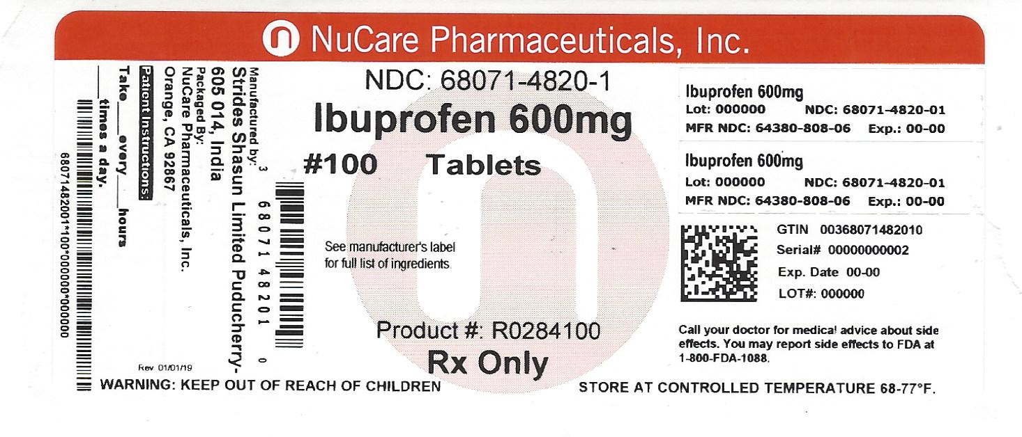 The following 2 images provide visual information about the product associated with Ibuprofen NDC 68071-4820 by Nucare Pharmaceuticals,inc., such as packaging, labeling, and the appearance of the drug itself. This resource could be helpful for medical professionals, pharmacists, and patients seeking to verify medication information and ensure they have the correct product.
