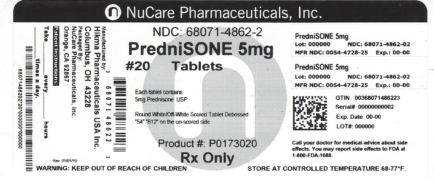 NuCare Pharmaceuticals, Inc. has a product called PredniSONE 5mg which comes in a bottle with 20 tablets. Each tablet contains 5mg of Prednisone USP. The lot number is 000000 and the product number is P0173020. The manufacturer NDC is 0054-4728-25 and the NDC for the product is 68071-4862-02. The tablets have "H 3" on one side and "612" on the other. The product has a warning to keep it out of reach of children and to store it at a controlled temperature of 68-77°F.*