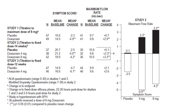 In a pooled analysis of placebo-controlled hypertension studies with about 300 hypertensive patients per treatment group, doxazosin, at doses of 1 to 16 mg given once daily, lowered blood pressure at 24 hours by about 10/8 mmHg compared to placebo in the standing position and about 9/5 mmHg in the supine position. Peak blood pressure effects (1 to 6 hours) were larger by about 50 to 75% (i.e., trough values were about 55 to 70% of peak effect), with the larger peak-trough differences seen in systolic pressures. There was no apparent difference in the blood pressure response of Caucasians and blacks or of patients above and below age 65. In the same patient population, patients receiving doxazosin gained a mean of 0.6 kg compared to a mean loss of 0.1 kg for placebo patients.