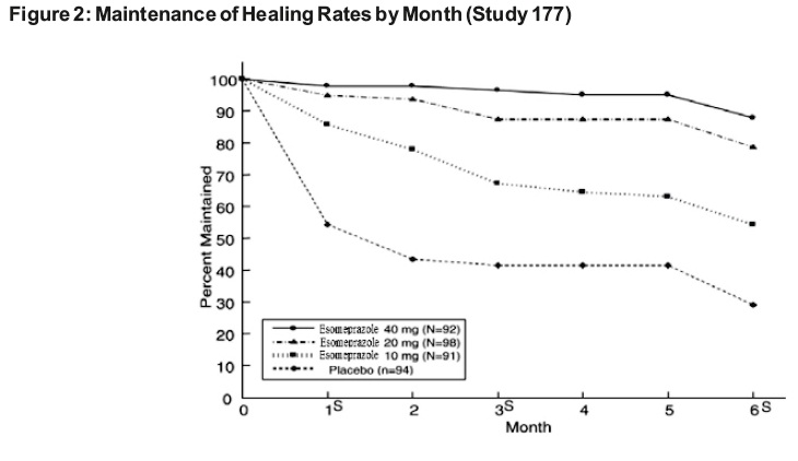 Esomeprazole magnesium is indicated to maintain symptom resolution and healing of erosive esophagitis. Controlled studies do not extend beyond 6 months.