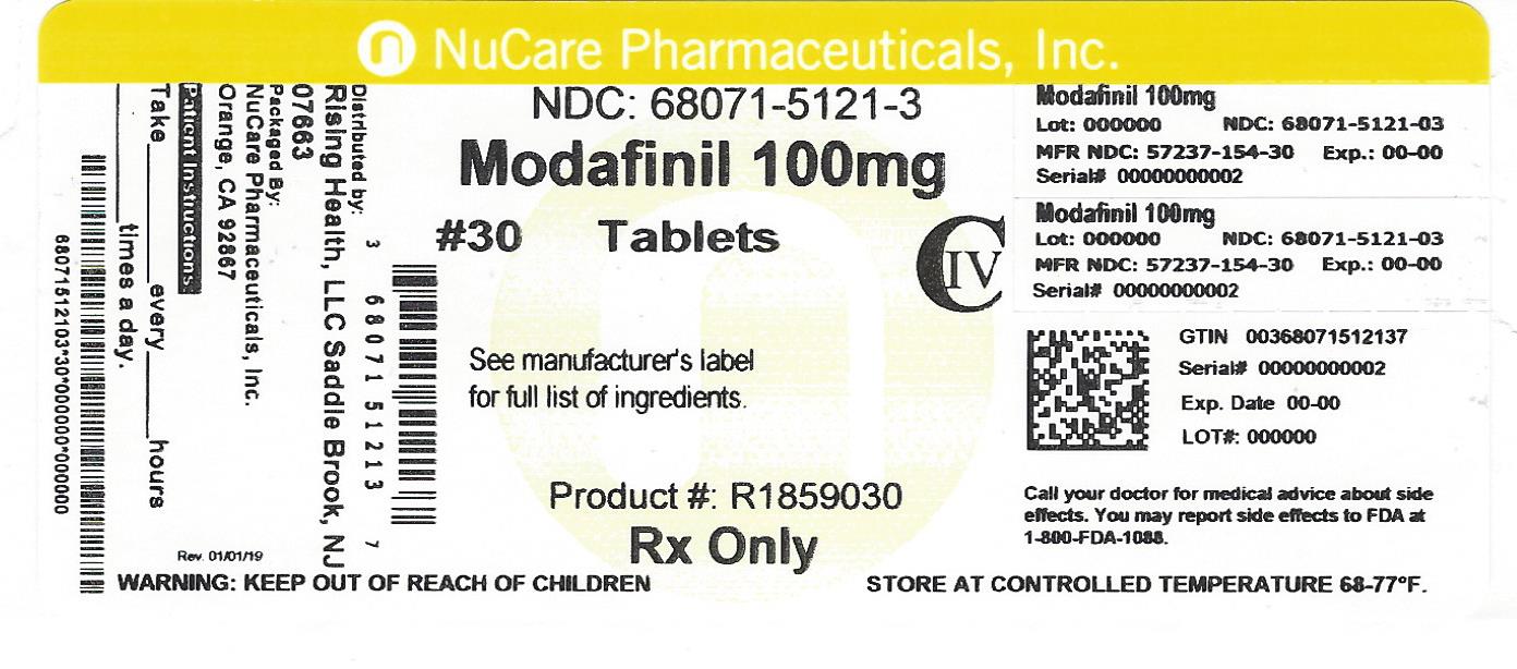 The following 2 images provide visual information about the product associated with Modafinil NDC 68071-5121 by Nucare Pharmaceuticals,inc., such as packaging, labeling, and the appearance of the drug itself. This resource could be helpful for medical professionals, pharmacists, and patients seeking to verify medication information and ensure they have the correct product.