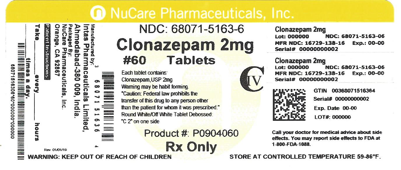 The following 2 images provide visual information about the product associated with Clonazepam NDC 68071-5163 by Nucare Pharmaceuticals,inc., such as packaging, labeling, and the appearance of the drug itself. This resource could be helpful for medical professionals, pharmacists, and patients seeking to verify medication information and ensure they have the correct product.