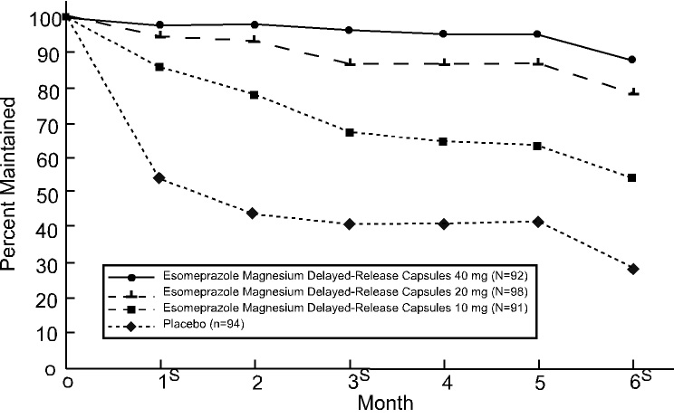 Esomeprazole magnesium delayed-release capsules are indicated to maintain symptom resolution and healing of erosive esophagitis. Controlled studies do not extend beyond 6 months.