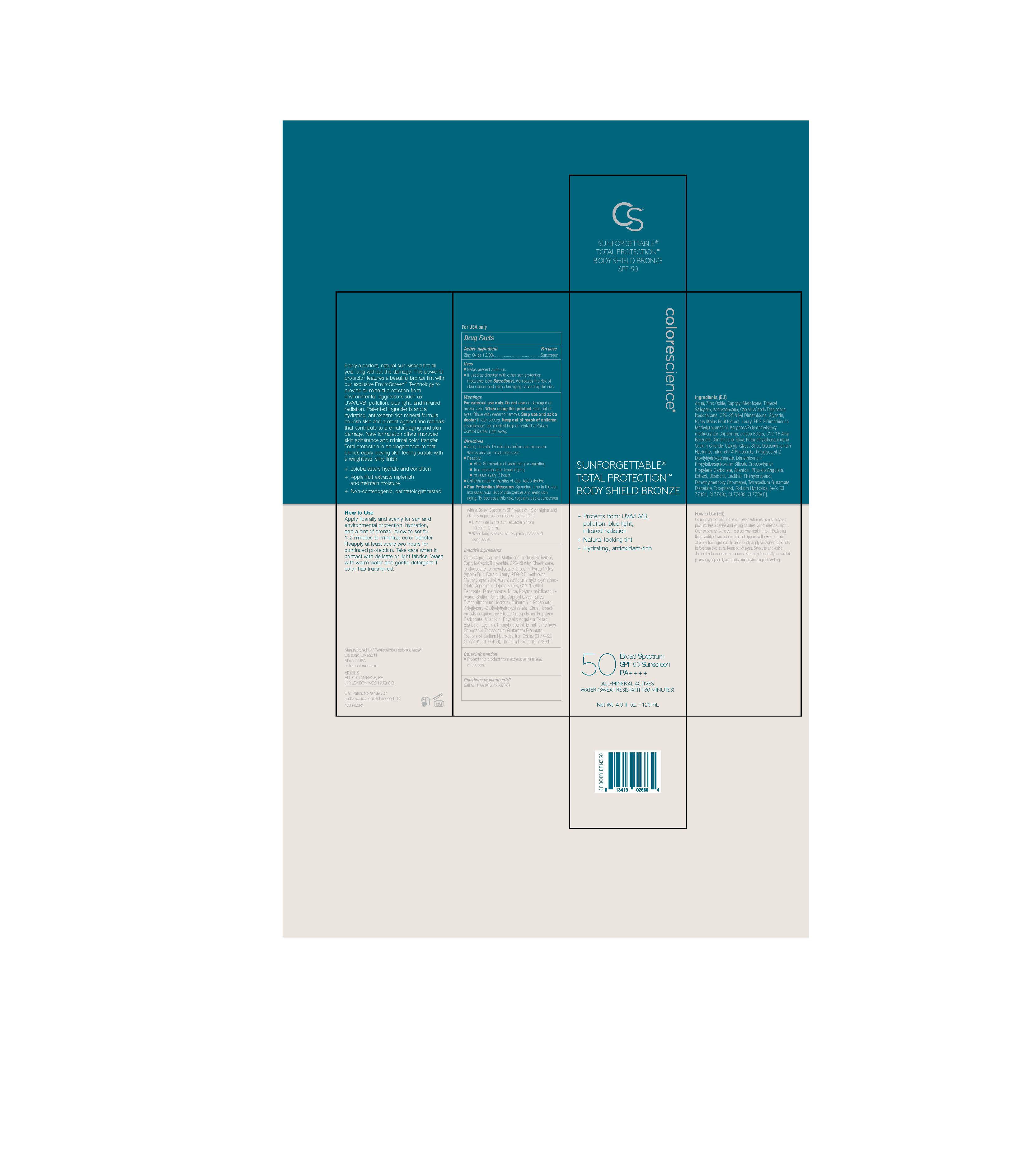 The following image provide visual information about the product associated with Sunforgettable Total Protection Body Shield Bronze NDC 68078-044 by Colorescience, such as packaging, labeling, and the appearance of the drug itself. This resource could be helpful for medical professionals, pharmacists, and patients seeking to verify medication information and ensure they have the correct product.