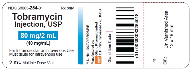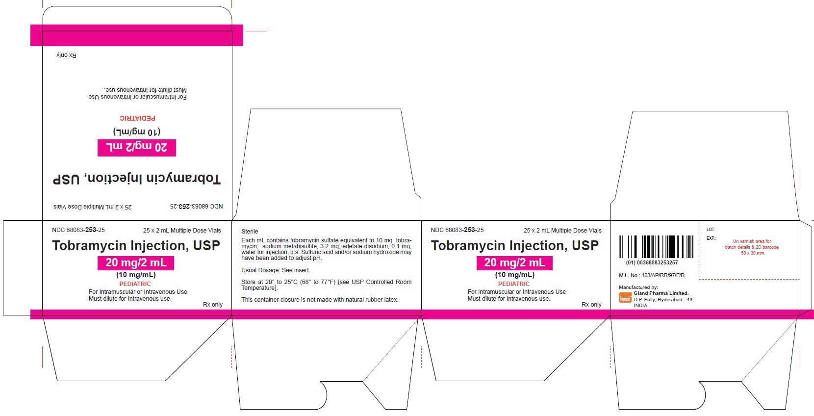 NDC 68083-253-01 is a prescription drug called Tobramycin Injection USP. Each 2 mL vial contains 20mg of Tobramycin which should be diluted for intravenous administration. The drug is suitable for pediatric use and can be given intramuscularly or intravenously. The drug is produced by Gland Pharma Limited in Hyderabad, India. There is also a unique identification number (M.L No: 108APIRRISTIFR) on the vial along with some other codes. The vial is a multiple-dose container, and the drug is only available on prescription. The label also has an expiration date (EXP).*