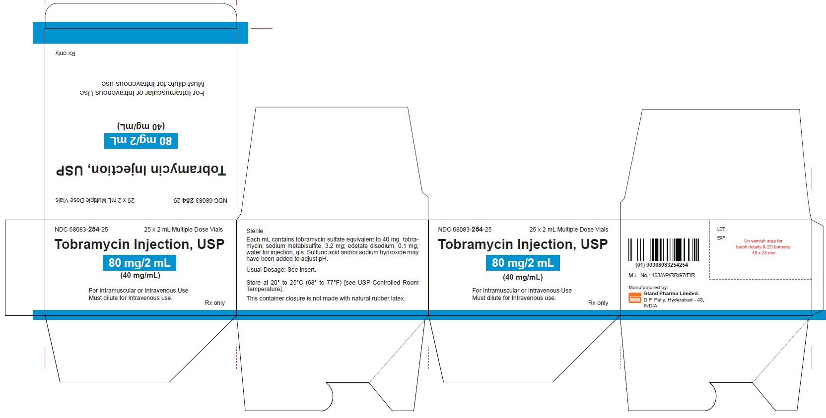 It is a product information label of Tobramycin Injection, a sterile solution which is to be diluted for Intramuscular or Intravenous use. The medication is stored at a controlled USP temperature range of 20-25°C or 68-77°F. It contains Tobramycin sulfate equivalent to 10mg of Tobramycin, and multiple doses are available in 2mL vials. The usual dosage and instructions for use are not available in the text. The label also includes manufacturing information about the product's maker, Gland Pharma Limited, and the product's National Drug Code (NDC) - 66083-253-25.*