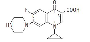 This is a label of a medication package called Ciprofloxacin. Each tablet contains 750mg of the medication. The package was produced on LOT 123456. The expiration date is 02/16.*