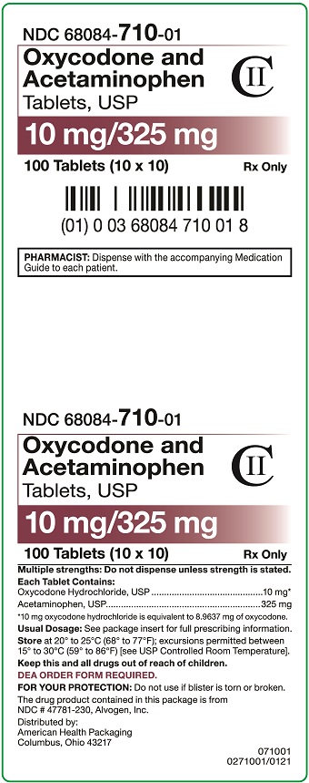 NDC 68084-710-01 is a prescription drug containing Oxycodone Hydrochloride and Acetaminophen. The package contains 100 tablets (10 x 10). Each tablet has 10mg Oxycodone Hydrochloride and 325mg Acetaminophen. The usual dosage instructions are provided in the package. The drugs should be stored between 20° to 25° C (58° to 77°F). The package also includes instructions for the pharmacist to dispense with the accompanying medication guide to each patient. The drug must be kept out of the reach of children, and a DEA order form is required. The drug is distributed by American Health Packaging in Columbus, Ohio, and it should not be used if the package is damaged or broken.*