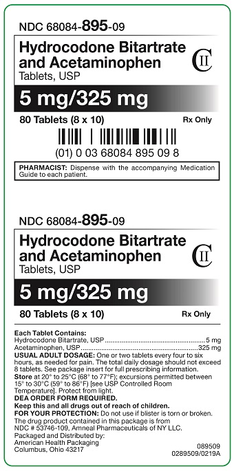 This is a description of a prescription medication with NDC number 68084-895-09. It contains Hydrocodone Bitartrate and Acetaminophen USP and comes in the form of 80 tablets, each tablet containing 5mg of Hydrocodone Bitartrate and 325mg of Acetaminophen. The medication is prescribed to manage pain, with instructions for the usual adult dosage of 1 to 2 tablets every 4 to 6 hours. The packaging advises to keep the drugs out of reach of children, to not consume broken tablets, and provides storage instructions for the medication. The package is distributed by American Health Packaging of Ohio.*