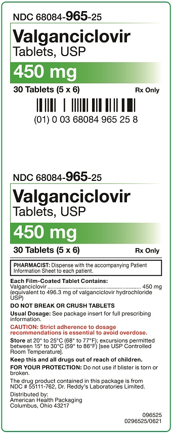 Valganciclovir Tablets are a prescription medication that contains Valganciclovir 450mg, which is equivalent to 4963 i of valganciclovir hydrochloride USP. These tablets come in a package of 30 (5 x 6) film-coated tablets and should not be broken or crushed. It is essential to adhere to the recommended dosage to avoid overdose. The tablets should be stored at a temperature between 20° to 25°C (58" o 77°F), with excursions permitted between 15°o 30°C (59" o 86°F) as per USP Controlled Room Temperature. The accompanying Patient Information Sheet must be given to each patient. This medication is manufactured by Dr. Reddy's Laboratories Limited and distributed by American Health Packaging, Columbus, Ohio.*