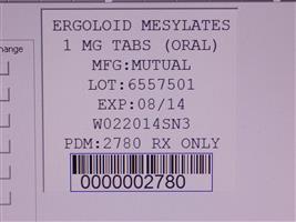 This is a medication called Ergoloid Mesylates, which comes in the form of 1 mg oral tablets. It is manufactured by Mutual Pharmaceuticals and the specific lot number is 6557501. The expiration date is listed as 08/14 and the product code is W0220145N3. The medication is only available with a prescription (RX Only).*