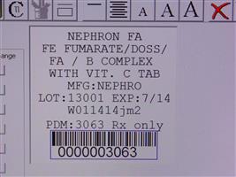NEPHRON FA is a tablet supplement that contains FE_FUMARATE/DOSS/ and FA/B COMPLEX with VIT. C. It is manufactured by NEPHRO and has a lot number of 13001 with an expiry date of 7/14. The remaining characters do not provide useful information.*