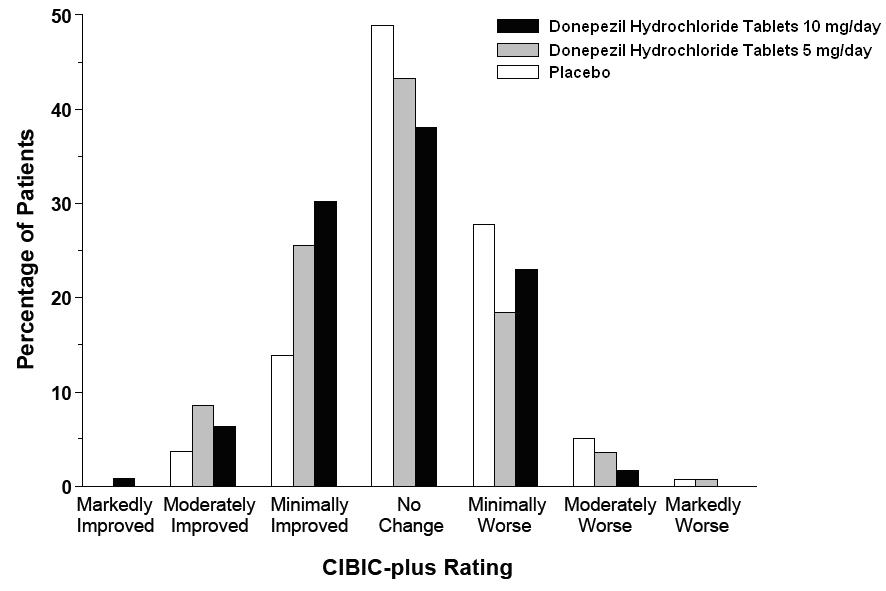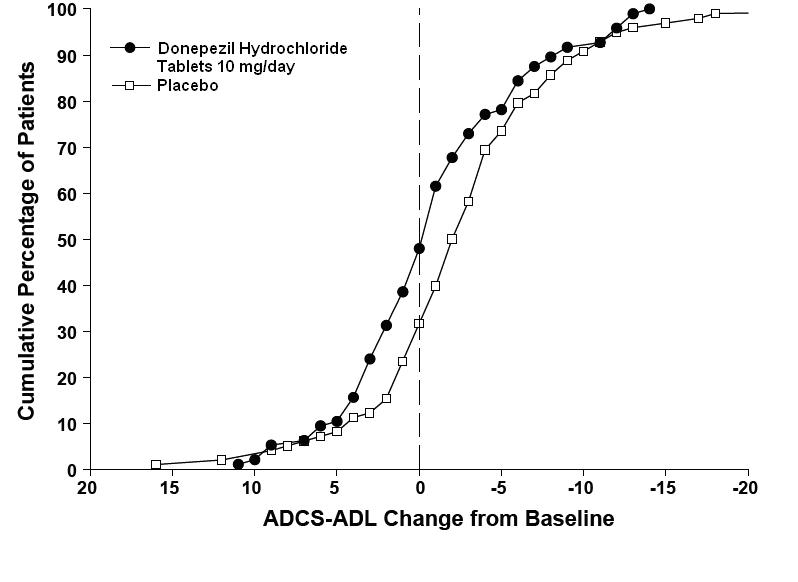 This is a graph displaying the cumulative percentage of patients receiving Donepezil Hydrochloride Tablets at different dosages and also the placebo, based on their change in ADAS-cog score. The ADAS-cog score is a measure of cognitive function in Alzheimer's disease patients. The graph shows that patients receiving the higher dose of Donepezil Hydrochloride Tablets (10 mg/day) experienced greater improvement in cognitive function compared to those receiving a lower dose (5 mg/day) or placebo. The x-axis shows the change from baseline (initial ADAS-cog score) and the y-axis shows the cumulative percentage of patients.*