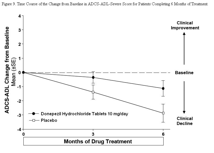 This is a graph that shows the time course of change from baseline in ADCS-ADL-Severe score for patients who completed 6 months of treatment. The x-axis represents the time in months, while the y-axis represents the ADCS-ADL-Severe score. There are two lines: one for patients who received donepezil hydrochloride tablets 10 mg/day and one for patients who received a placebo. The graph suggests that patients who received donepezil hydrochloride tablets experienced some clinical improvement. However, a detailed description of the results cannot be given due to lack of context.*