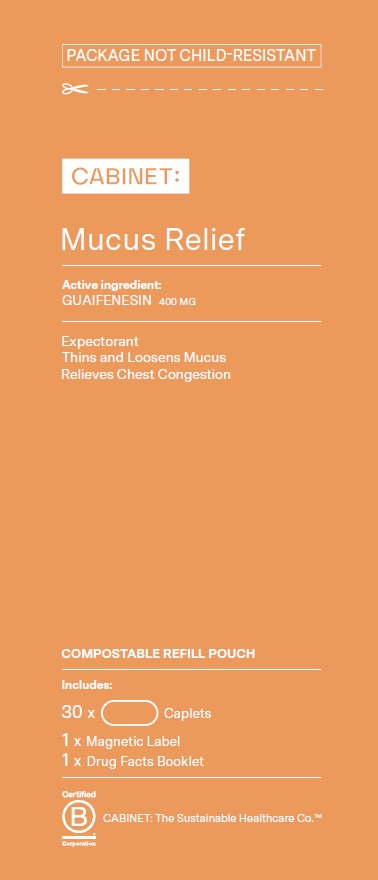 This is a package of Mucus Relief medicine which contains Guaifenesin as its active ingredient. It is an expectorant that helps to thin and loosen mucus and relieve chest congestion. The package includes 30 caplets, a magnetic label for convenience and a drug facts booklet. The refill pouch is compostable. However, the package is not child-resistant.*