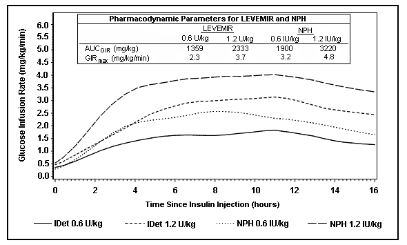 This appears to be a table that shows the Glucose Infusion Rate in mg/kg/min for two types of insulin - LEVEMIR and NPH. It also provides pharmacodynamic parameters for both insulins at different doses and time intervals after injection. AUC and GIR (glucose infusion rate) are listed for each.*