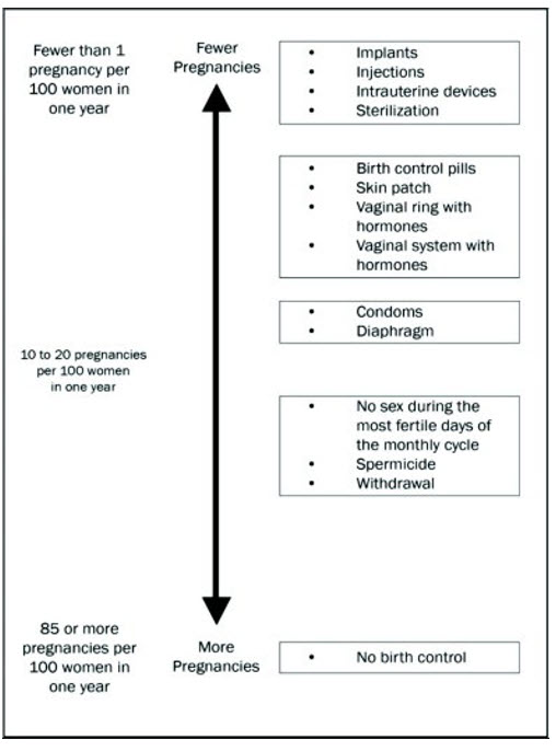 This text highlights different methods of birth control and their effectiveness in preventing pregnancies. It provides information on the number of pregnancies per 100 women using specific birth control methods, ranging from fewer than 1 to 101 or more. The text also lists various contraceptive options such as implants, injections, intrauterine devices, sterilization, birth control pills, condoms, diaphragms, and other methods like avoiding sex during fertile days and using spermicide or withdrawal.*