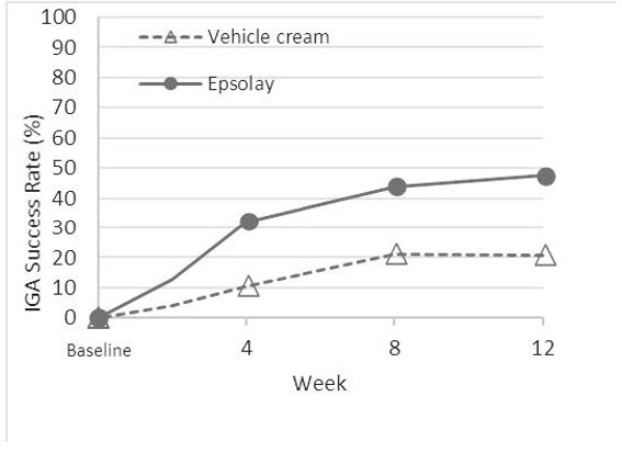 The co-primary efficacy endpoints in both trials were the proportion of subjects with treatment success at Week 12, defined as an IGA score of 0 ("clear") or 1 ("almost clear") with at least a two-grade reduction from baseline, and the absolute change from baseline in inflammatory lesion counts at Week 12. The results at Week 12 are presented in Table 3. EPSOLAY was more effective than vehicle cream on the co-primary efficacy endpoints starting from 4 weeks of treatment in both trials, see Figure 1 through Figure 4.