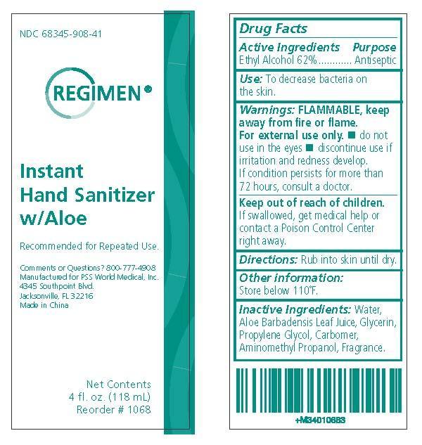 REGIMEN Instant Hand Sanitizer with Aloe is a 41 oz (118 mL) bottle of antiseptic hand sanitizer containing 62% Ethyl alcohol. It is intended for reducing bacteria on the skin and can be used repeatedly. Manufactured for PSS Work Medical, it should be stored below 1107 and should not be used in eyes. If redness and irritation occur or persist for over 72 hours, consult a doctor. If swallowed, contact a Poison Control Center immediately. The inactive ingredients include Water, Aloe Barbadensis Leaf Juice, Glycerin, Propylene Glycol, Carbomer, Aminomethyl Propanol, and Fragrance. For inquiries or comments, call 800-777-4208. Made in China.*