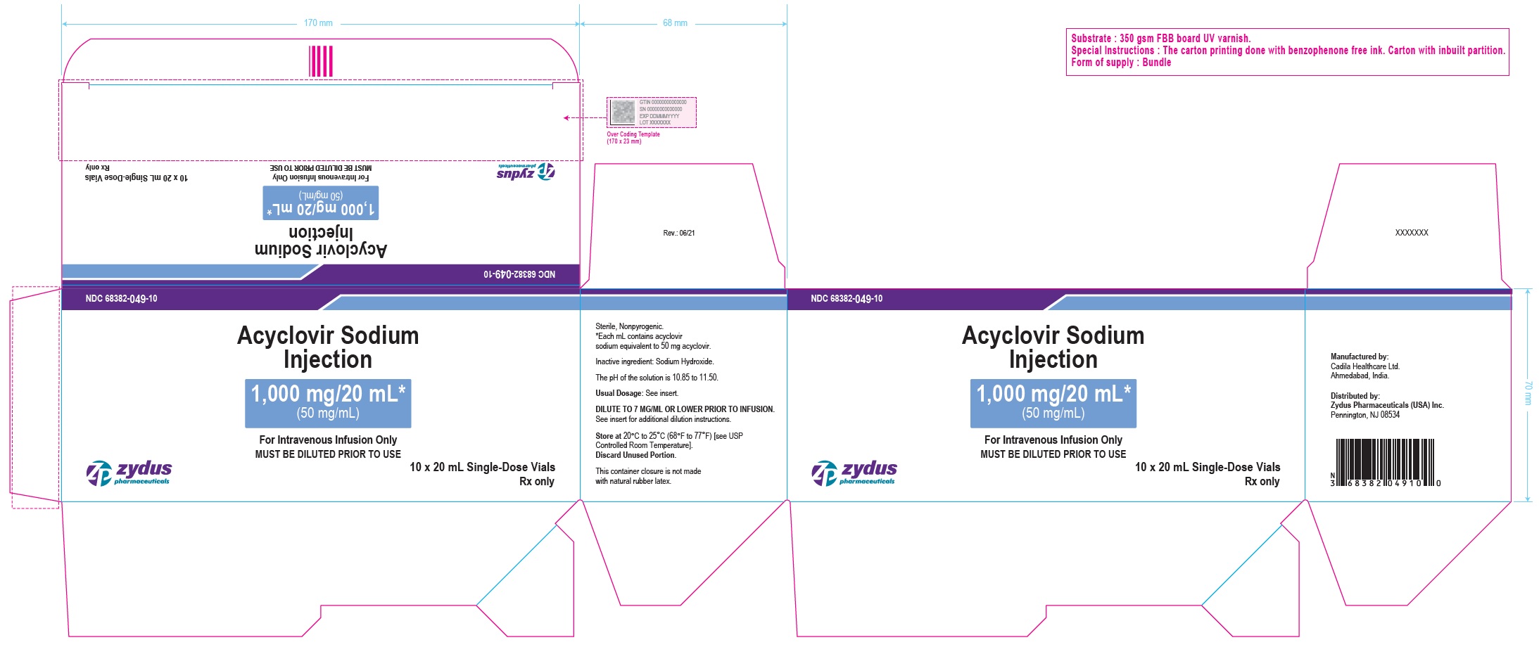 Acyclovir Sodium Injection is a medication that is used for intravenous infusion only. Each single-dose vial contains 500mg/10ml of the active ingredient, Acyclovir Sodium. It is essential to dilute the solution before infusion, and the instructions for dilution are available in the insert. The medication must be stored between 20°C to 25°C and discarded if unused. The carton printing is benzophenone-free and comes with an inbuilt partition. This product is manufactured by Cadila Healthcare in Ahmedabad, India, and distributed in the US by Zydus Pharmaceuticals. The National Drug Code is 68382-048-10.*