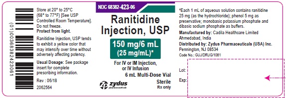This is the description of a medicine called Ranitidine Injection USP, packaged in a single-dose vial for intravenous or intramuscular injection. The drug is a rapid-onset medication that is used to prevent and treat ulcers in the stomach and intestines, and is also effective in treating reflux and heartburn. The drug is yellow in color, has a high potency, and should be protected from light, as defined by the USP. It is manufactured by Cadia Healthcare Limited in Ahmedabad, India, and distributed by Zydus Pharmaceuticals (USA) Inc. in Pennington, New Jersey. The usual dosage is provided in the package insert containing complete prescribing information.*