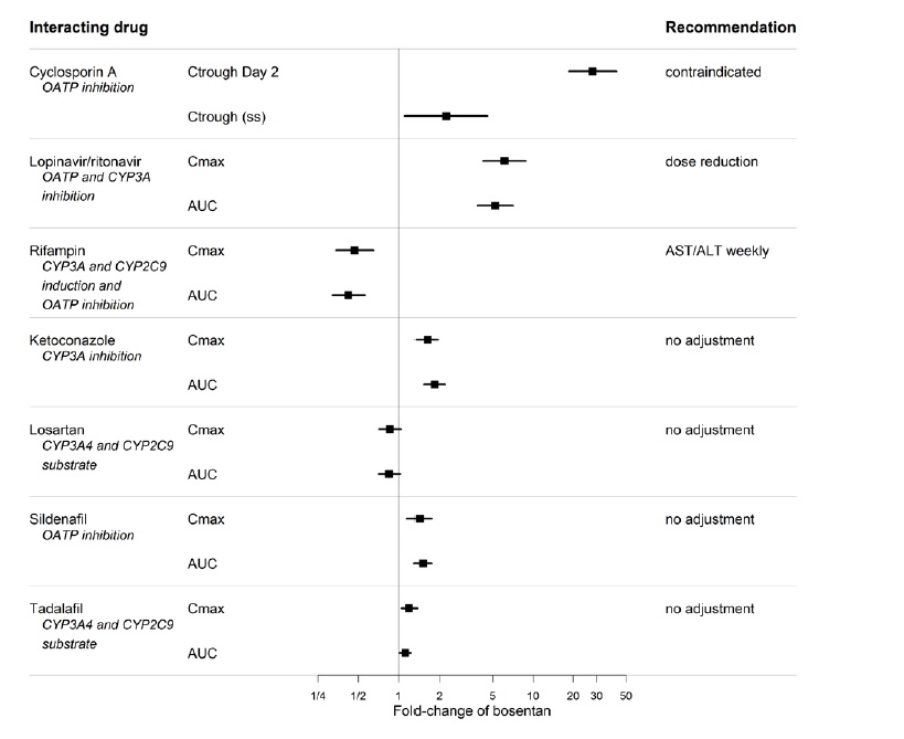 This text appears to be a chart showing different drugs and their interactions with enzymes, as well as measurements of their impact on the body's response to the drugs. The drugs mentioned are Cyclosporin A, Lopinavirritonavir, and Rifampin. The chart measures the "Ctrough Day 2," "Ctrough (ss)," "Cmax," and "AUC" of each drug at different time intervals. It also evaluates the "fold-change of bosentan." The chart recommends a dose reduction or weekly monitoring of AST/ALT for certain drugs and deems one drug contraindicated.*