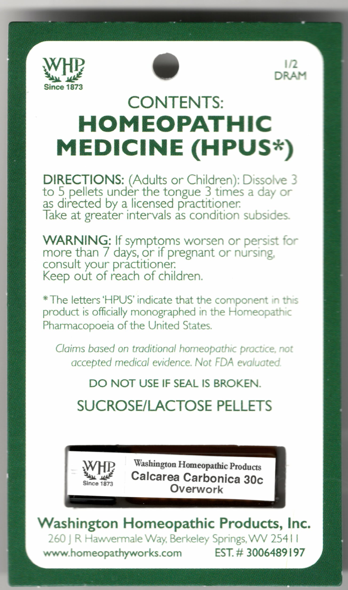 This is a description for a homeopathic medicine containing Sucrose/Lactose Pellets and Calcarea Carbonica 30¢c. The medicine is dissolved under the tongue 3 times a day and it is indicated for homeopathic practices. The letters 'HPUS' indicate the component in this medicine is officially monographed by the Homeopathic Pharmacopoeia of the United States. The warning states that if symptoms worsen or persist for more than 7 days or if pregnant or nursing, one should consult their practitioner. Claims are based on traditional homeopathic practices and not FDA evaluated. The product is from a company called Washington Homeopathic Products.*