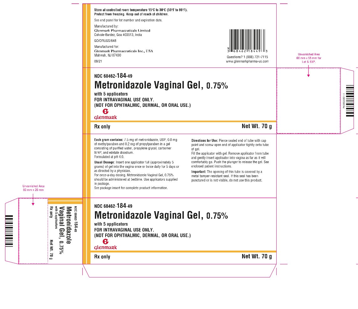 The following 8 images provide visual information about the product associated with Metronidazole NDC 68462-184 by Glenmark Pharmaceuticals Inc., Usa, such as packaging, labeling, and the appearance of the drug itself. This resource could be helpful for medical professionals, pharmacists, and patients seeking to verify medication information and ensure they have the correct product.