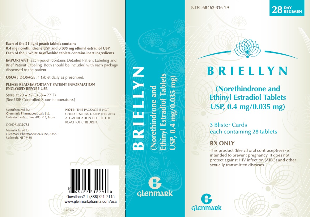 This is a package of oral contraceptive pills named Briellyn, containing 21 light peach tablets with 0.4 mg norethindrone USP and 0.035 mg ethinyl estradiol USP, and 7 white to off-white placebo tablets. It should be stored at 20-25°C and kept out of reach of children. There are detailed patient labeling and brief patient labeling included, and the usual dosage is 1 tablet daily as prescribed. It is manufactured by Glenmark Pharmaceutical Ltd in India and Glenmark Pharmaceuticals Inc. in the USA with the product code GOMDRUGS 785 and NDC 68462-316-29. This product is only available by prescription and is intended to prevent pregnancy, but it cannot protect against HIV infection (AIDS) and other sexually transmitted diseases.*